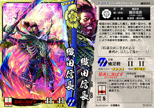 この信長は4.0コスの槍ですが、並行スペック且つ魅力(昂揚)ともうひとつの特技を持っている点で土方と同じですね