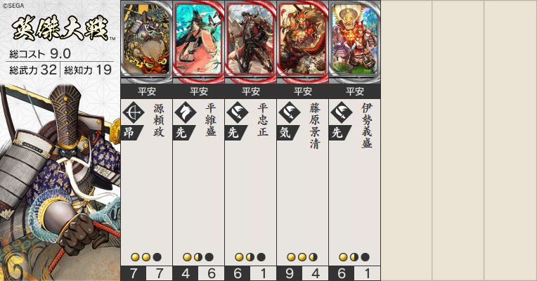 頼政+維盛+景清が決まったので、残り3コスどうしようかな~と思ってとりあえず武力盛ったら出来ました。