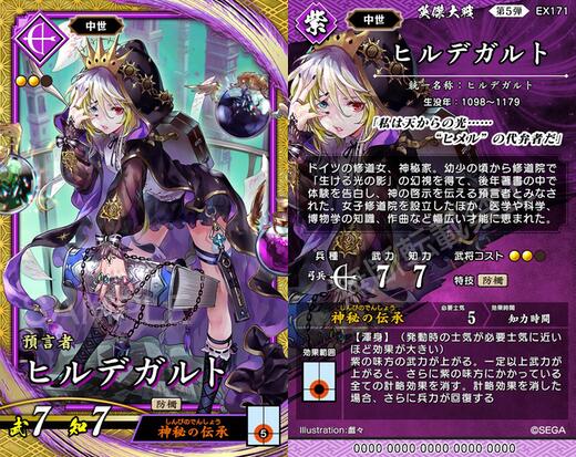 よって初日に使ったのがこんな構築でした。紫の渾身じゃない号令の中でも屈指のまともな効果である鬼道丸の号令からヒルデガルトに繋げるパターンです。ヒルデガルト自身は追加効果を得られませんが、そこは追加効果を諦めています。
