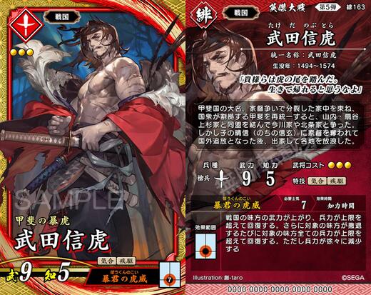 スペックと基礎性能が似通っている3コスト清盛と比較してみると、清盛は陣形なので広がりづらいことと士気を勝手に食う都合上フルコンが難しいのが難点で、信虎の場合は広がりやすく士気は勝手に食わないけども勝手に兵力を食う分計算が難しく、主力部隊が落ちた後はかなりしょっぱい効果になりそうなのがデメリット。あと緋の戦国って案外そこまで目立ったのがいない分混色になるのかもしれませんが、そうなると士気流派1の下方がしんどいところです。