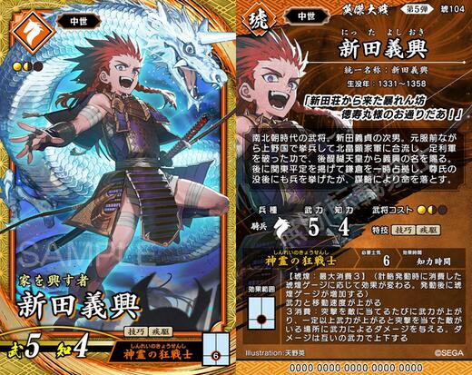 彼はいくつかデッキを組んでみて、実際に全国大戦もしていました。しかし士気6剣3も使うのにそこからさらに何度か突撃しないと武力が上がらないという効果の悠長さ、そして1.5コス騎馬を新田にするということは市来琴という最強格の1.5コストを抜くか、無理な構築にして入れるかという非常に厳しい二択を迫られてしまいます。
