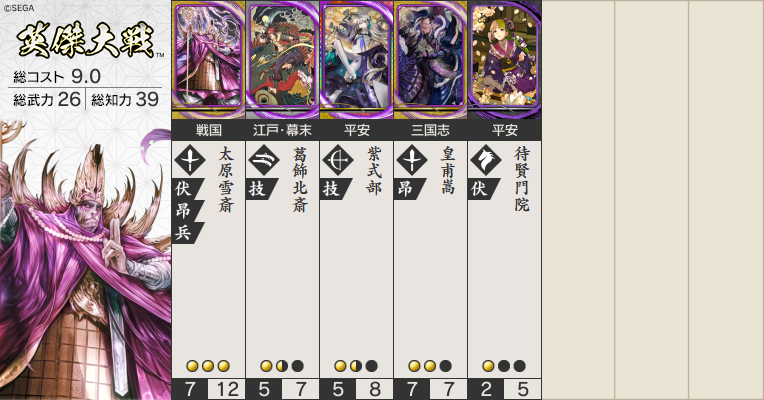 戦国のころ、プレイ回数すごい人でこんな構成の人がいた気がします その頃は北斎の枠が早川殿(騎馬)だったはずですが…